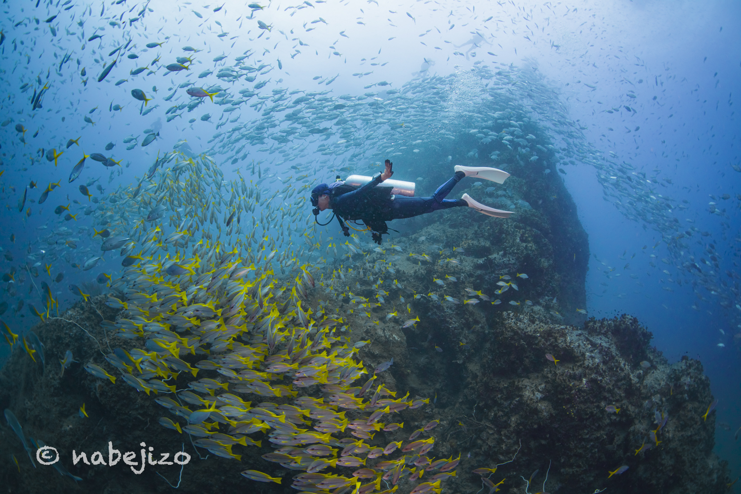 ギンガメアジに、タテフエダイ、クロホシフエダイが入り乱れて、賑やかなお祭り騒ぎ。