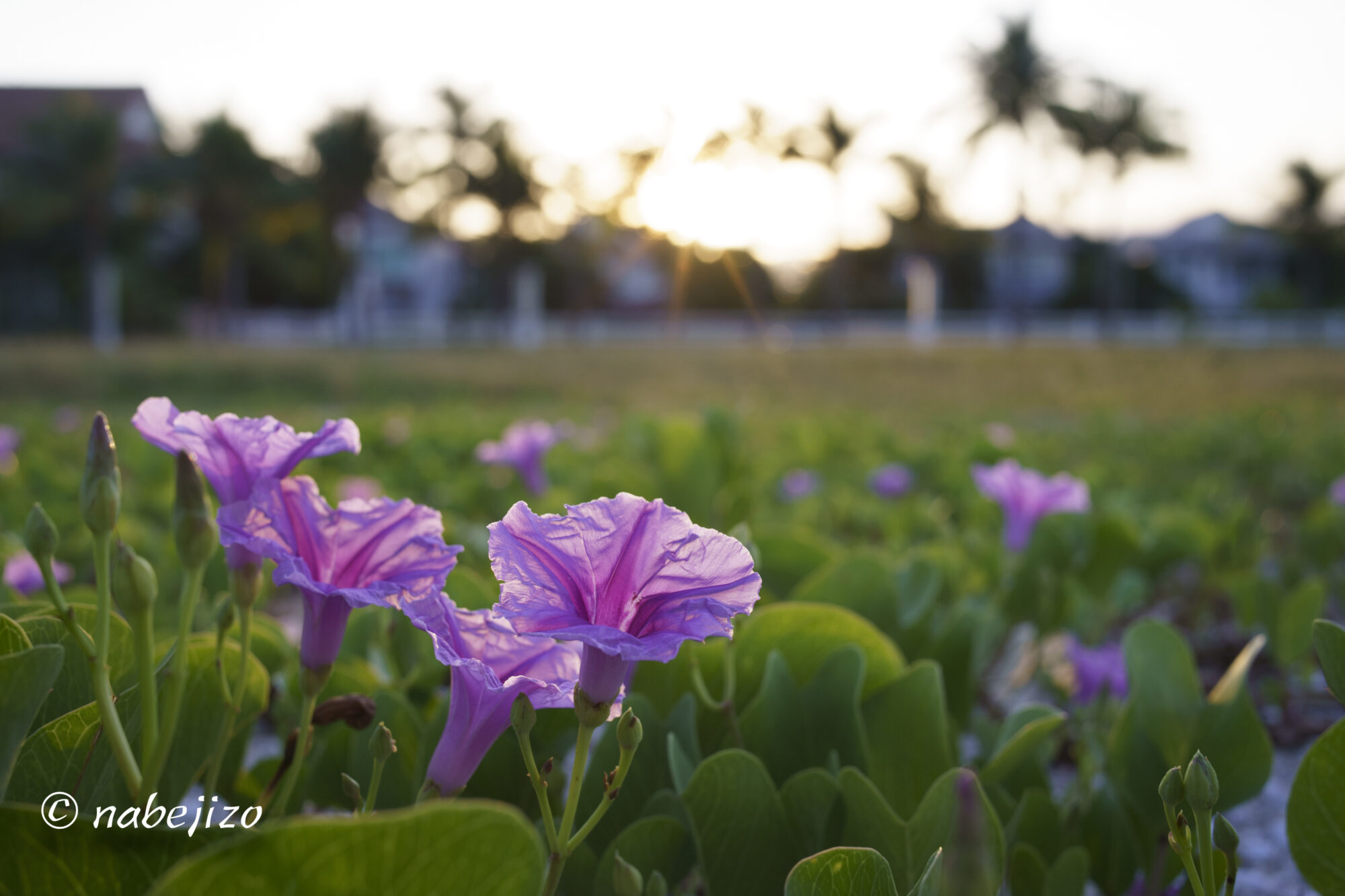 バンプラの山を越えて日光が差し込むとグンバイヒルガオの花が開き始めます。